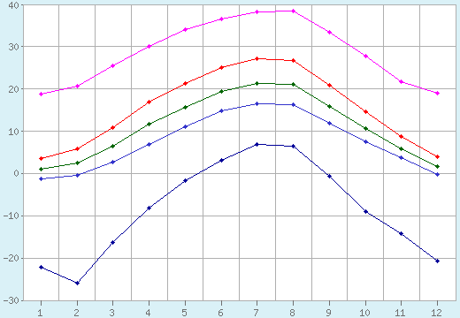 | Месяц | Абсолют. минимум | Средний минимум | Средняя | Средний максимум | Абсолют. максимум |
