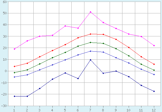 | Месяц | Абсолют. минимум | Средний минимум | Средняя | Средний максимум | Абсолют. максимум |