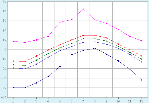| январь | -40.0 (1975) | -19.5 | -16.0 | -12.2 | 8.3 (1996) |