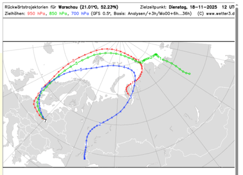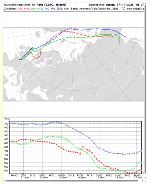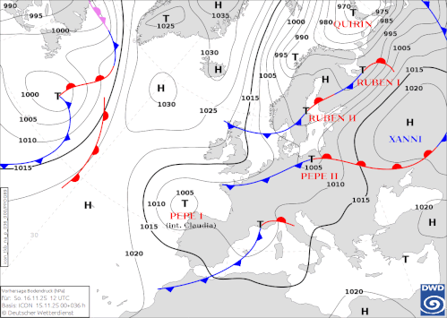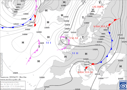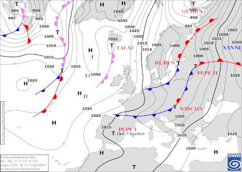 Мощный антициклон (с чудным немецким именем Yi) в Атлантике в блоке с Гренландским. Похоже пока на тот, который был в мае в этом году и принес тогда аномально холодную погоду. Разница лишь только в том, что здесь ситуацию кардинально смягчает теплая Балтика, в то время как в мае остывшее после зимы море весьма укрепляло холодные позиции.