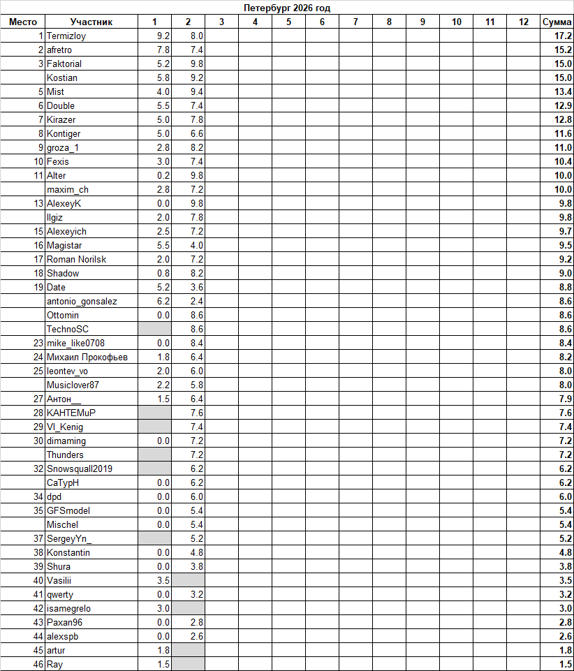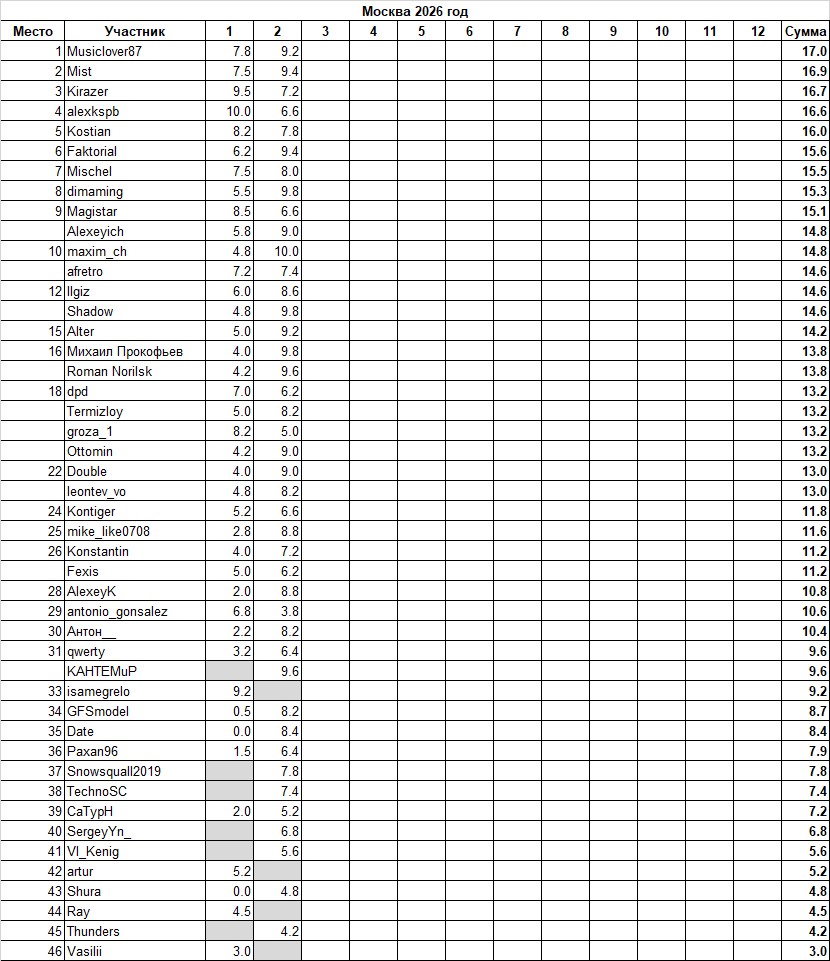 Цитата: Thunders от 28 февраля 2026, 20:22:41Thunders, в этот раз обошлось. Тср за 26 и 28 получилась ниже прогнозов и в итоге мои -8,5 "затерялись" - лидерство досталось maxim_chЦитата: Михаил Прокофьев от 26 февраля 2026, 11:56:36*сокр* Просто куда мне призовое место и баллы - пусть получат другие участникиВы серьезно?)![]()