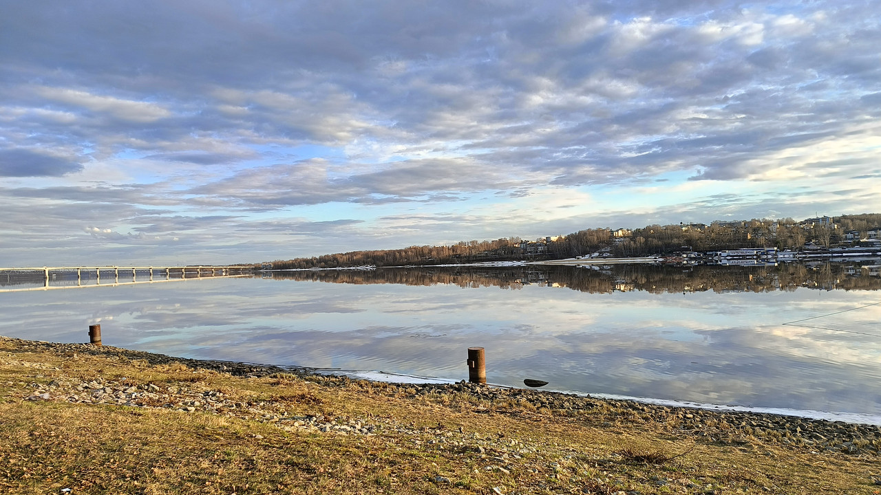 Волга-матушка. Как бальзам на душу после неубранных дворов. Вы только посмотрите, это невероятно, она как зеркало натурально. Отражает правый берег в мельчайших подробностях, мало того, что чистая талая водица, так ещё и ряби даже мало, никаких волн. Летом уже такого не будет.