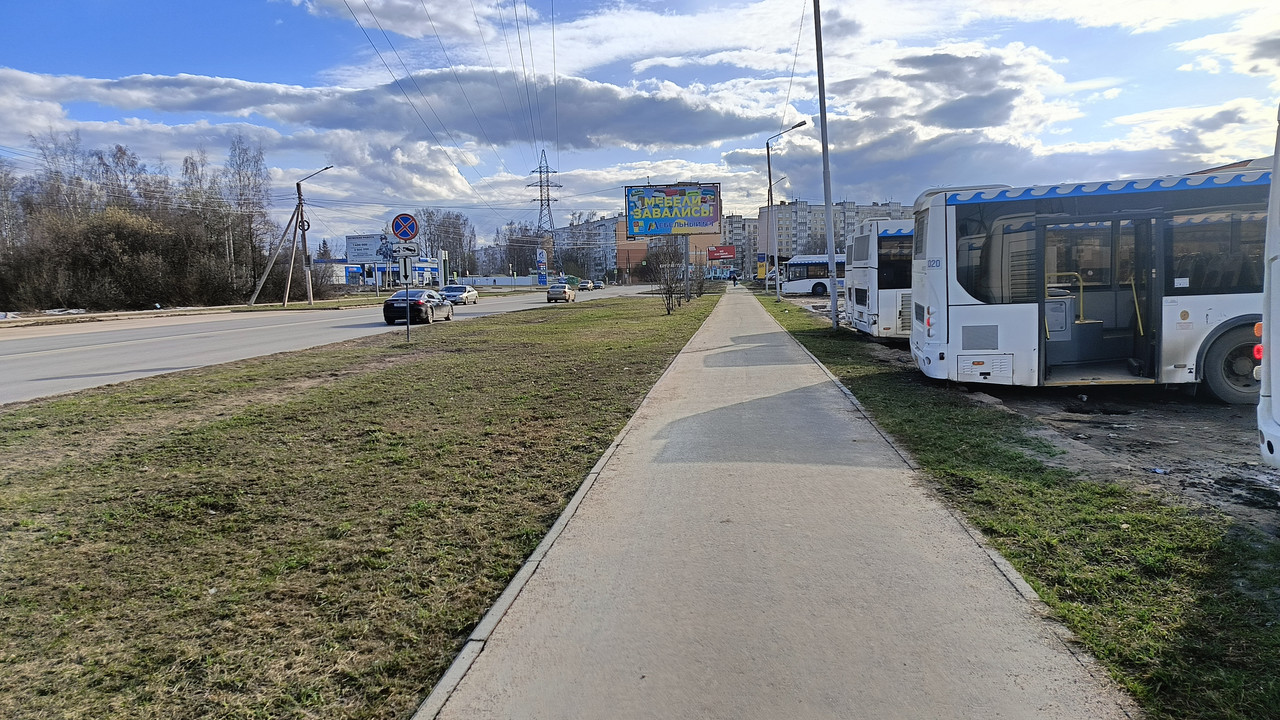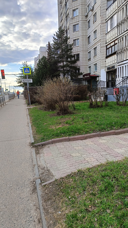 Приятно пройтись по чистому сухому асфальту и не скользить по грязи. Это самая окраина города. Сбоку на газоне что-то появляется (зимой он был раскопан, поэтому это не прошлогодняя трава).