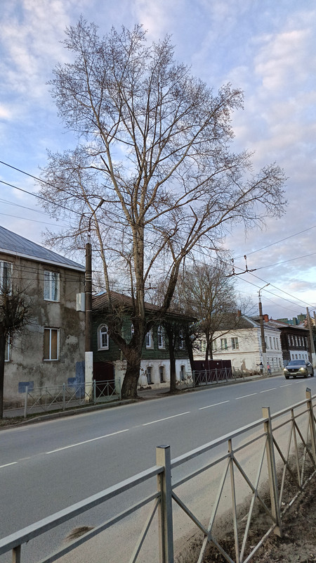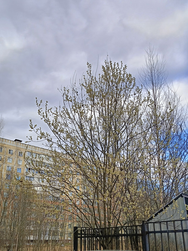 Ива (обычная, не плакучая, плакучие у нас тоже есть, но пока видел только в двух экземплярах на опытном поле в Караваево, а также в Ярославле, а вот в Костроме в "общем доступе" никто не удосужился посадить пока, хотя выросла бы). И на этой прямой иве тоже есть слабая зелёная дымка, хотя поменьше, чем на черёмухе.