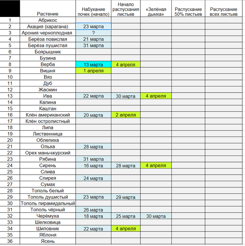 Здесь надо ещё написать, что со 2 апреля на каштане почки набухли и про спирею, что у нее листья начали распускаться, и я уже внёс эти изменения в файл, но слишком поздно увидел эти косяки, а второй раз грузить через ВПН накладно будет, поэтому в следующий раз, когда таблица обновится, увидите исправленную версию.