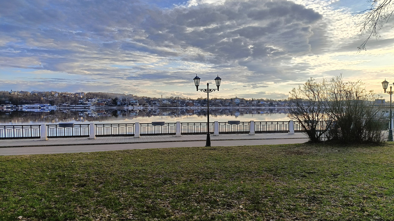 Ещё одна картинка с зеркальной Волгой. И газончик уже зеленеет постепенно, правда, возле Волги, видимо, прохладно, и этот процесс там замедлен.