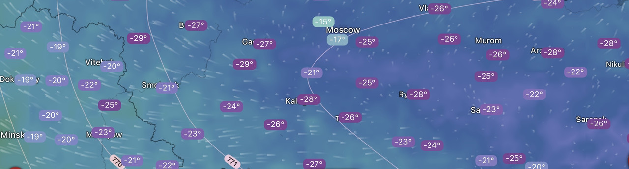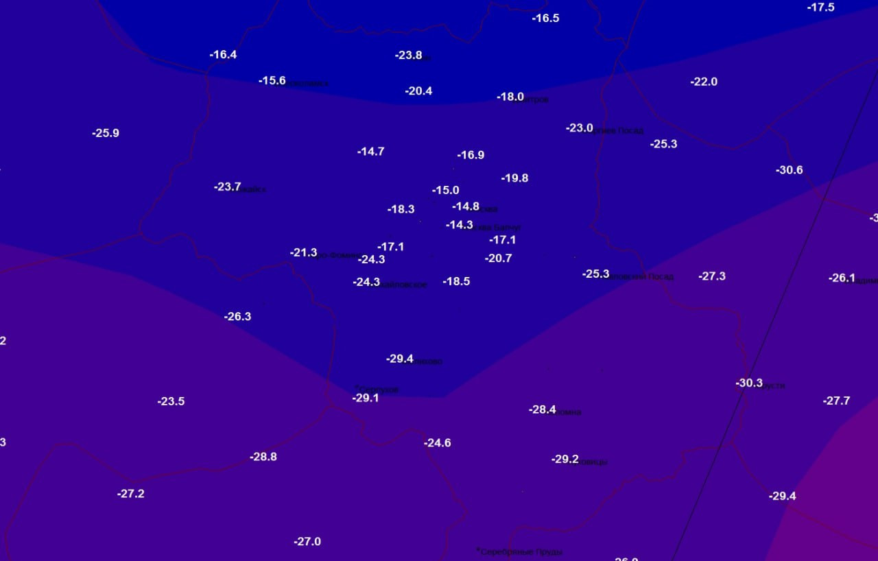 Калуга около -30, Рязань тоже близко. Там около -28. Тула морозный четвертак взяла. Да и даже Домодедово всё-таки -26. И это всё на фоне позорных опушечных -15 :-X Слов нет!