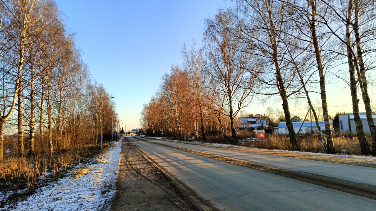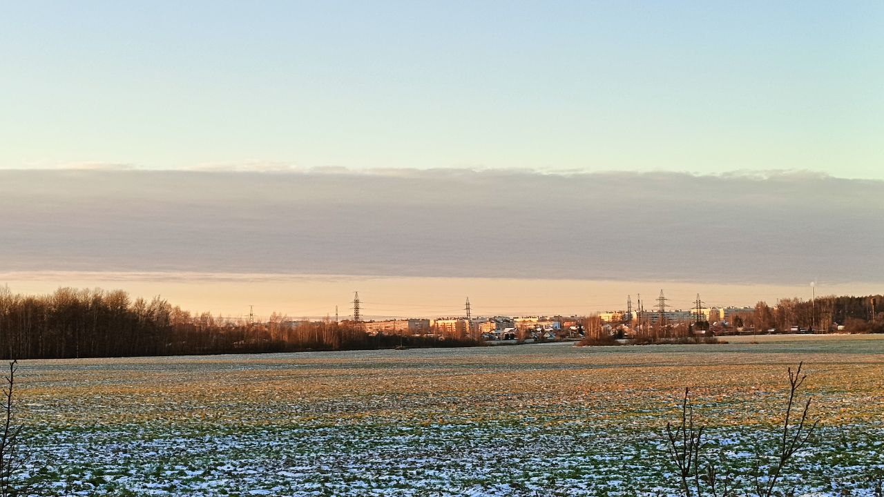 А это уже окраины Костромы виднеются на фоне необычного зелёно-белого поля (озимые, походу).