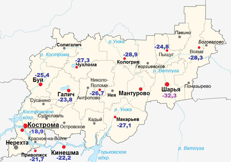 Минимумы марта в контраст с максимумами полноценно зимние. Шарья 9 марта аж -32,3 взяла. Даже более южные, чем Кострома, города Ивановской области Кинешма и Приволжск взяли конкретные двадцатники мороза. Но Кострома не взяла и со своими -18,9 оказалась неким островом тепла не только в границах современной области, но и всей исторической Костромщины.