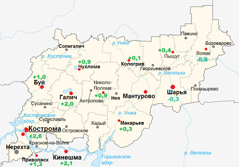 По средней температуре марта Кострома лидирует снова. В области везде, кроме Галича, было сильно холоднее. Даже довольно южный Макарьев взял околонулевой март. В Вохме и Шарье март и вовсе вышел метеозимним: -0,8 и -0,3 соответственно.
