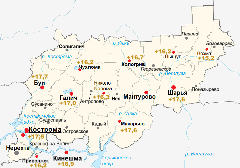 С осадками туго, засуха примерно везде: от 6 мм в Пыщуге до 19 мм в Макарьеве.