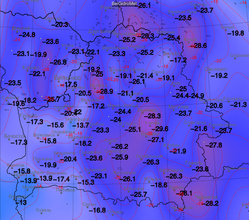 В Литве и Беларуси двадцатки, местами до -28...-29С. Кибартай на границе с областью -23.5С Если бы такое арктическое ядро задержалось хотя бы дня на три был бы вообще полный алес. Так что по сравнению с январем погода сжалилась. Дальше будет пробиваться циклон из Европы, но оттепель пока под вопросом, впрочем как и сама траектория циклона, который, похоже, как и в прошлый раз, опять застрянет, далеко не продвинувшись на север. Зато шуму то было в прогнозах и на форуме... 8)