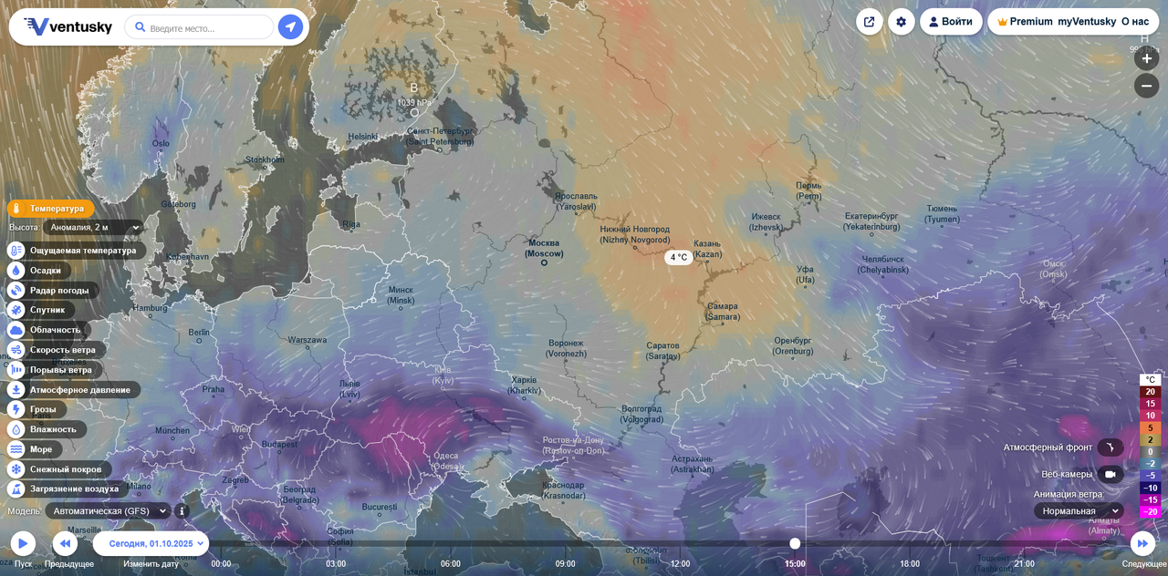 Слабое тепло идёт с севера. Саша Смирнов из КЛМ поди в экстазе от количества "синей аномалии".