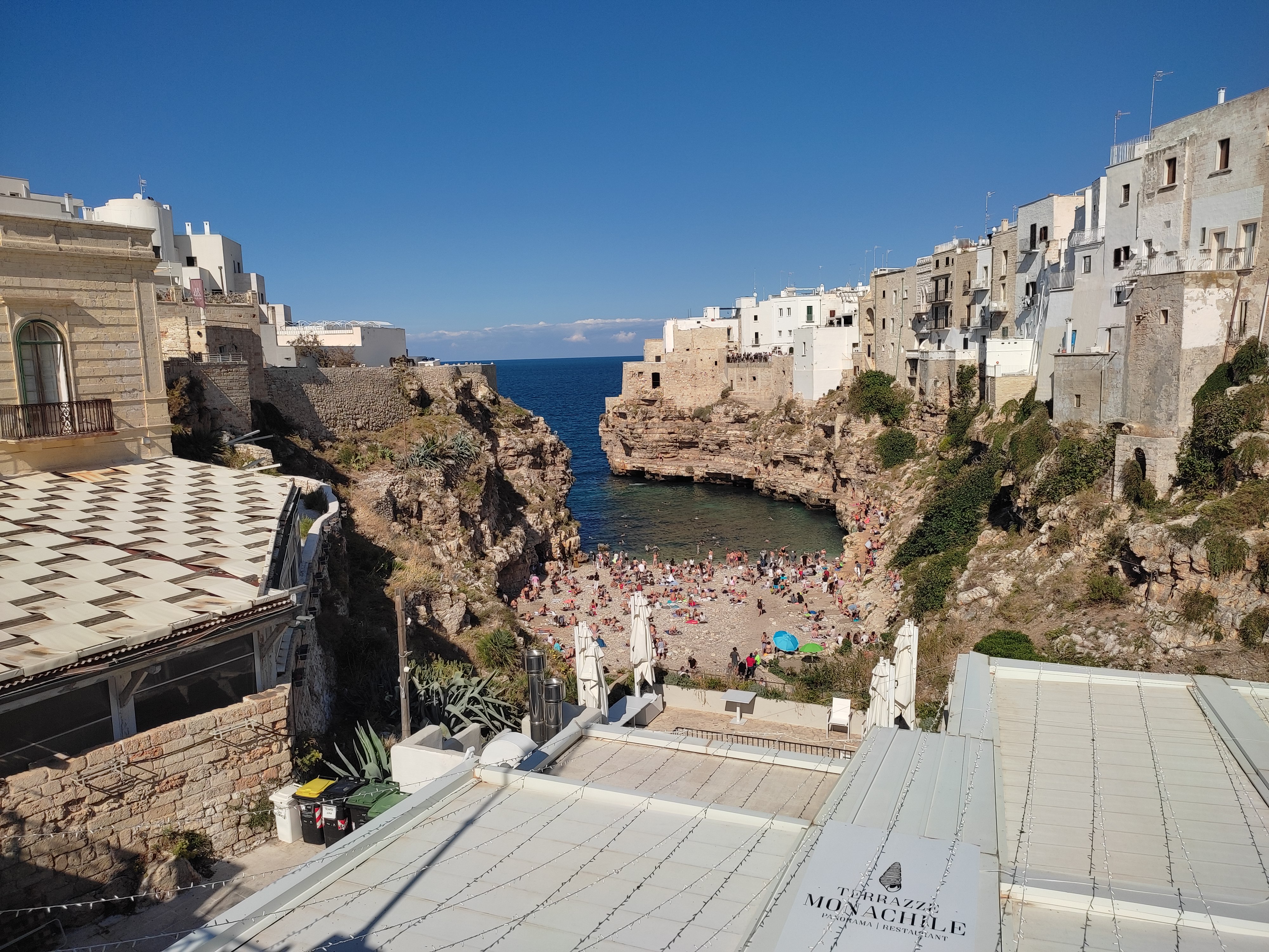Вчера приехал в Монополи и купался в море. Но здесь пляжей вообще нет,осми скаль,хотя Берег низкий равнинньй. Очень необьчно. В Болгарии везде где низкий берег есть песчанньй пляж, скаль и камни только там где горь и возвьшенности.