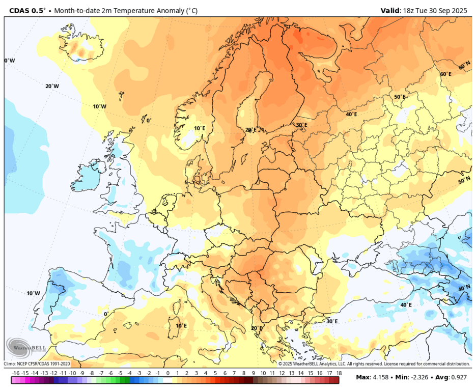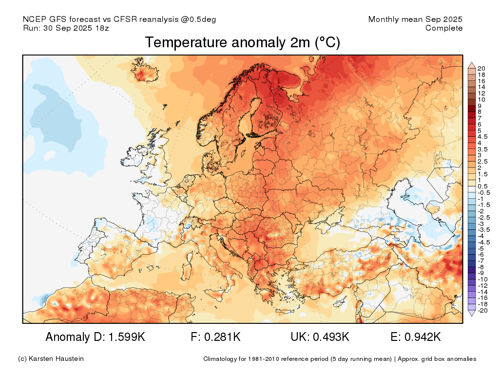 Карта достаточно неточная. По юго-западной половине Германии за сентябрь лишь "норма+" к 1961-1990 норме, наименьшая аномалия календарного месяца к норме 1961-1990 за последние 2,5 года, меньшей аномалия была в последний раз в апреле 2023.