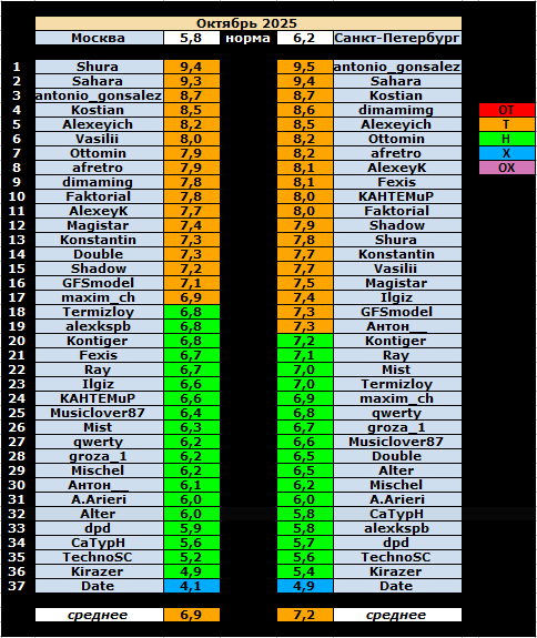 Порвать получится только в том случае, если ошибка вашего прогноза в двух городах не превысит 0,5 градуса(попадание в эти пределы — задача не из легких). При допущенной ошибке например в 1 градус баллы будут низкими и порвать кого-то в таблице не получится. Вам необходимо болеть за среднюю +8,0..+9,0. ::) В первой половине октября в Москве прогнозируется средняя температура как раз на уровне +8...+9 градусов. Но останется ли она такой же во второй половине месяца, вот в чём вопрос. Посмотрим.