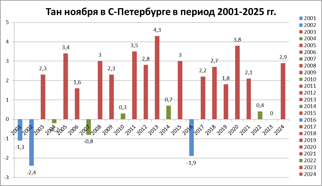 А что происходит в последние годы в Питере? Преобладает теплая осень, особенно потеплели ноябри, что демонстируется на этой диаграмме: