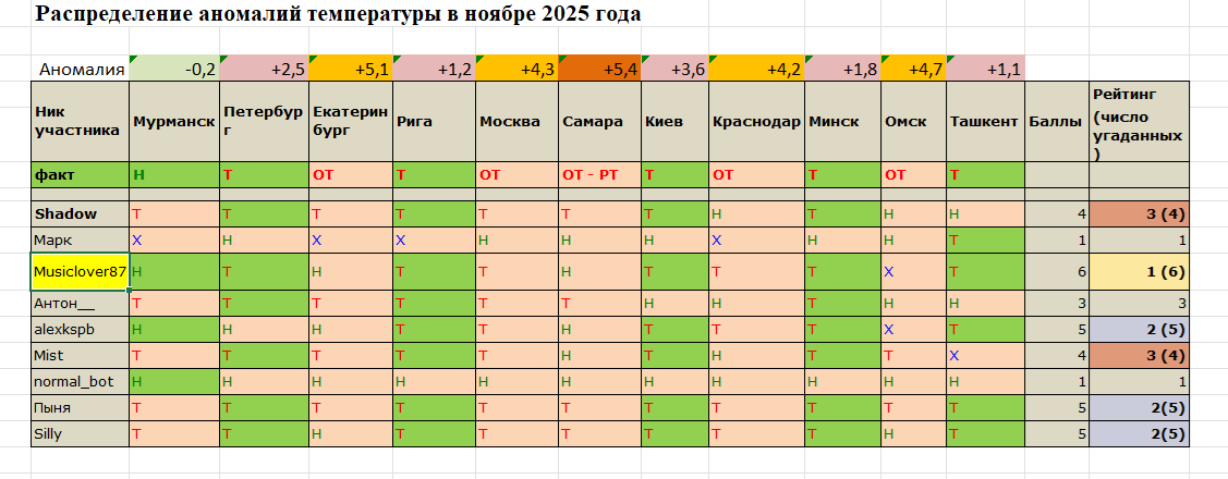 И в такой ситуации, за счёт правильного прогноза по Мурманску, победил Musiclover87.