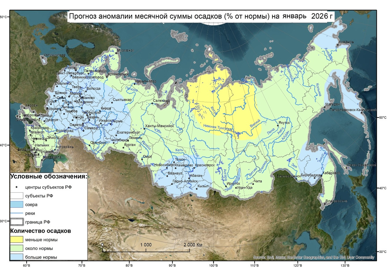 Влажным январь ожидается на ЕТР кроме самого юга и севера. Засушливым в малонаселенных северных районах Сибири. В остальной части страны увлажнение в пределах климата.