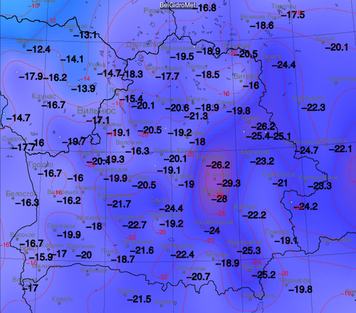Сегодня двадцатники в Беларуси расползлись еще большим пятном, чем вчера, а также двадцатиградусный мороз пришелся на Смоленскую и южнее - на Украину: