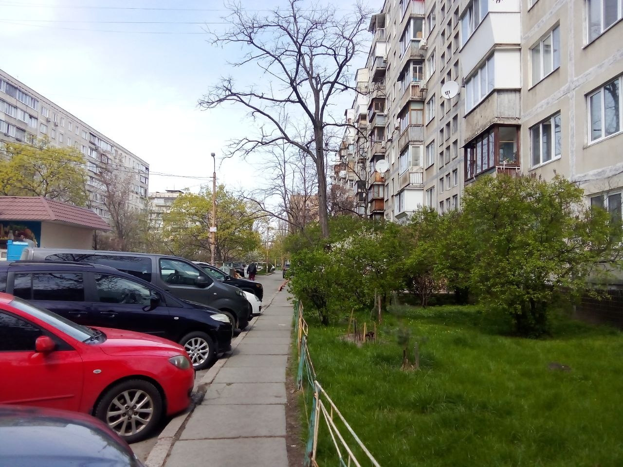 Двор Оболони, зелёные многие деревья и кусты, ну и в целом тут всё зелёное кроме абсолютно голой акации, вот уж есть!  :D