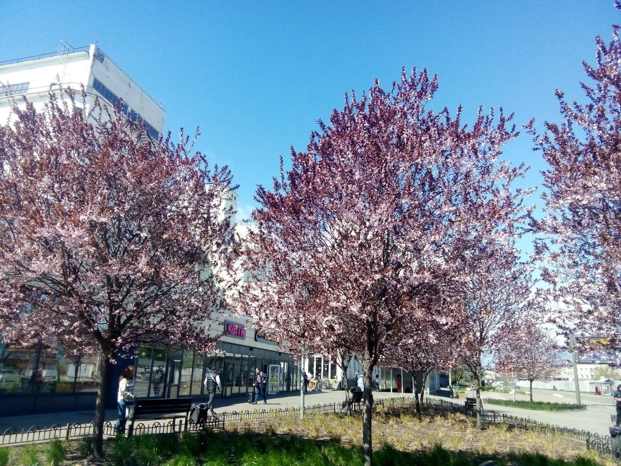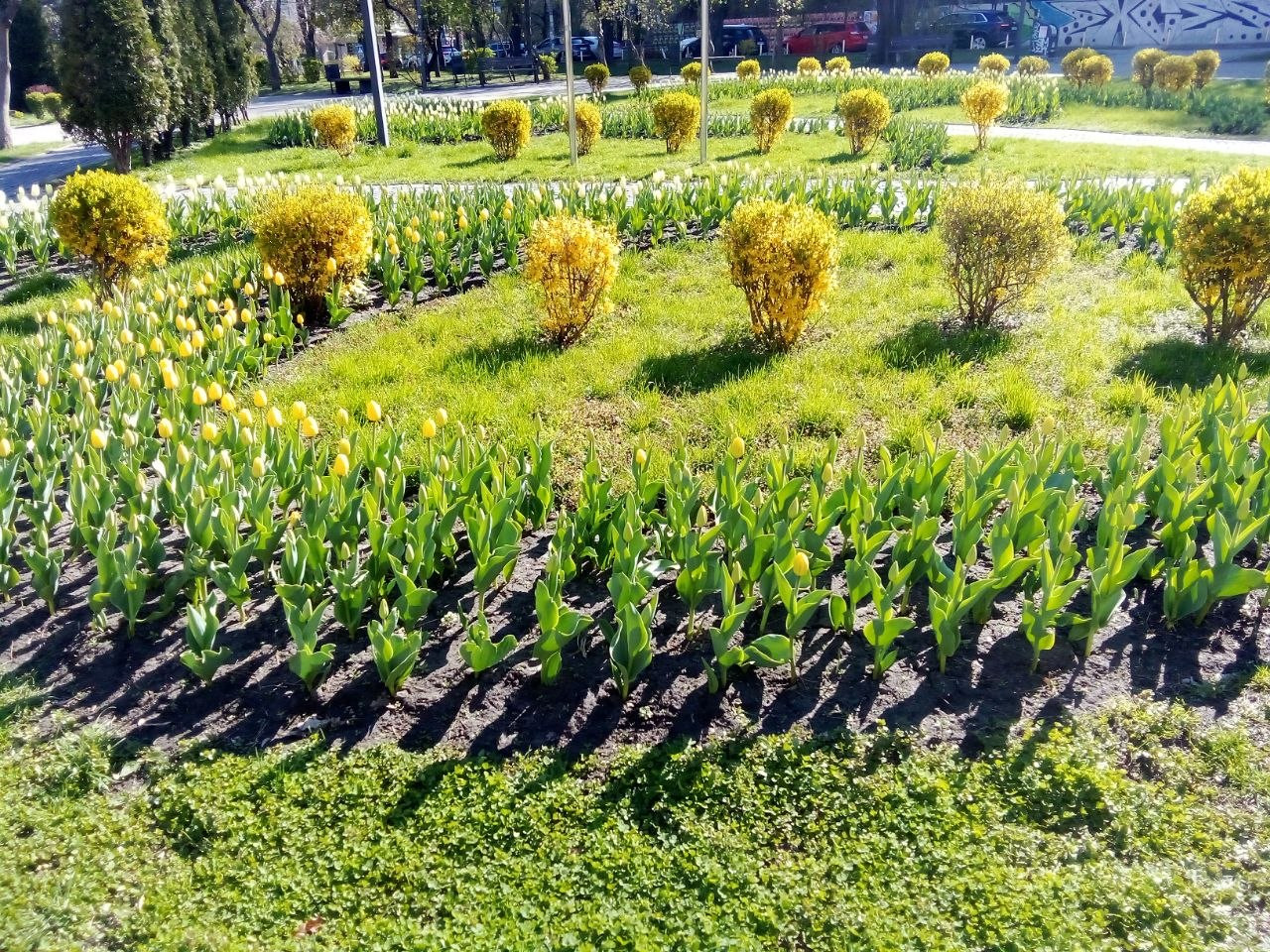 В сквере неплохо так пытаются расцвести тюльпаны, отцветает форзиция (покрытие зелеными листиками)