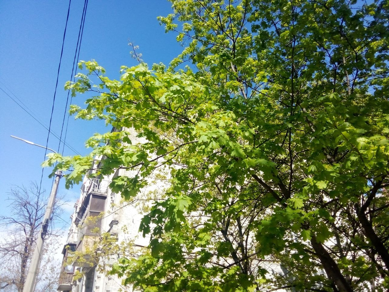 Так же начал отцветать клён остролистный, он же канадский/обыкновенный, на заднем плане видно ещё цветущий, на переднем - отцвёл и сомкнул крону