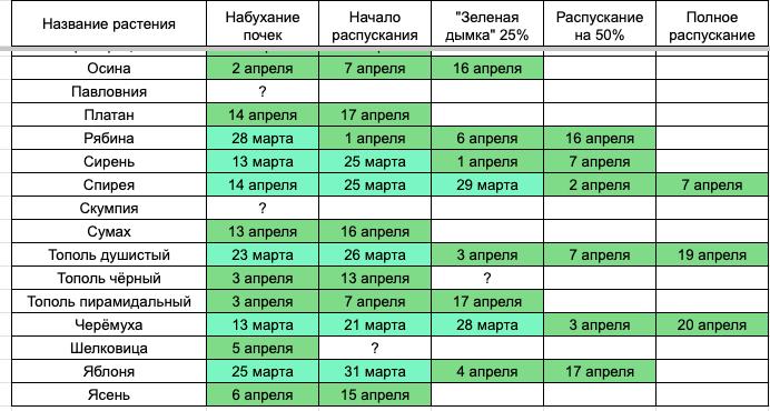 Таблица обновлена. Обращаю внимание на то, что начало вегетировать всё. Точно распустилось четыре вида, но не надо думать, что остальные лишь наполовину/дымка и всё, вот та же груша, вроде 90% распустилось, а по факту какая-то лесная груша не даёт мне допилить ячейку, ну я ж это делаю не чтоб выделываться "югом", а чтоб в "анналы истории" это вошло и я потом в возрасте эти таблицы пересматривал, потому груша пока простаивает, и так далее.