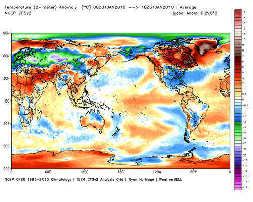 Довольно часто при аномальных циркуляциях, в которых забрасывается тепло далеко на север из-за устойчивых блоков в высоких широтах, на юге могут наблюдаться мощные отрицательные аномалии. А иногда, если развит континентальный антициклон, даже на очень больших территориях. Примером тому - январь 2010