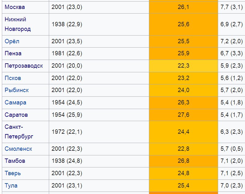 Читал статью в Вики про жару в 2010-ом и обнаружил, что июль тогда в Смоленске вышел с Тср +22,8. Для сравнения другие города: