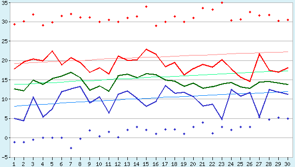 - Пояснения к графику. Текущие минимальная, средняя, максимальная температура воздуха в Кингисеппе представлены на графике сплошными линиями соответственно синего, зеленого и красного цветов. Нормальные значения показаны сплошными тонкими линиями. Абсолютные максимумы и минимумы температуры для каждого дня обозначены жирными точками соответственно красного и синего цвета.