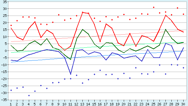 - Пояснения к графику. Текущие минимальная, средняя, максимальная температура воздуха в Нижнеудинске представлены на графике сплошными линиями соответственно синего, зеленого и красного цветов. Нормальные значения показаны сплошными тонкими линиями. Абсолютные максимумы и минимумы температуры для каждого дня обозначены жирными точками соответственно красного и синего цвета.
