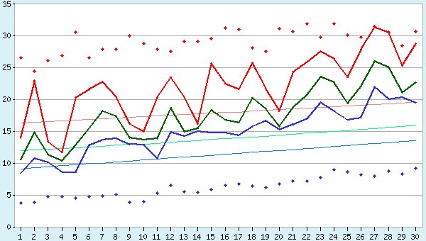 - Пояснения к графику. Текущие минимальная, средняя, максимальная температура воздуха в Владивостоке представлены на графике сплошными линиями соответственно синего, зеленого и красного цветов. Нормальные значения показаны сплошными тонкими линиями. Абсолютные максимумы и минимумы температуры для каждого дня обозначены жирными точками соответственно красного и синего цвета.