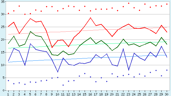- Пояснения к графику. Текущие минимальная, средняя, максимальная температура воздуха в Бресте представлены на графике сплошными линиями соответственно синего, зеленого и красного цветов. Нормальные значения показаны сплошными тонкими линиями. Абсолютные максимумы и минимумы температуры для каждого дня обозначены жирными точками соответственно красного и синего цвета.
