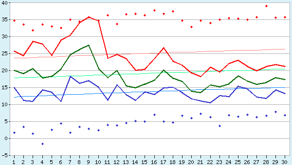 - Пояснения к графику. Текущие минимальная, средняя, максимальная температура воздуха в Воронеже представлены на графике сплошными линиями соответственно синего, зеленого и красного цветов. Нормальные значения показаны сплошными тонкими линиями. Абсолютные максимумы и минимумы температуры для каждого дня обозначены жирными точками соответственно красного и синего цвета.