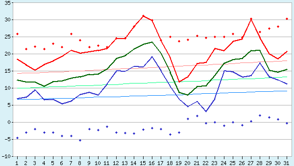 - Пояснения к графику. Текущие минимальная, средняя, максимальная температура воздуха в Измире представлены на графике сплошными линиями соответственно синего, зеленого и красного цветов. Нормальные значения показаны сплошными тонкими линиями. Абсолютные максимумы и минимумы температуры для каждого дня обозначены жирными точками соответственно красного и синего цвета.
