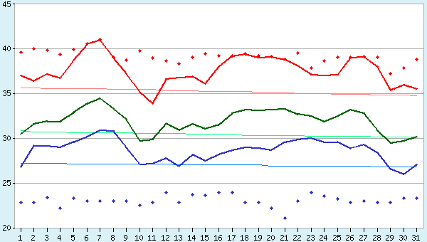 - Пояснения к графику. Текущие минимальная, средняя, максимальная температура воздуха в Бангкоке представлены на графике сплошными линиями соответственно синего, зеленого и красного цветов. Нормальные значения показаны сплошными тонкими линиями. Абсолютные максимумы и минимумы температуры для каждого дня обозначены жирными точками соответственно красного и синего цвета.