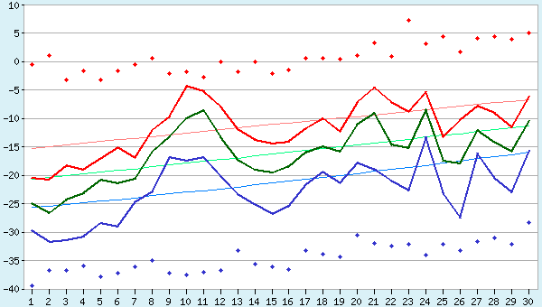 Самая низкая температура воздуха (-28.9°) была 13 декабря. Самая высокая температура воздуха (-7.9°) была 9 декабря.
