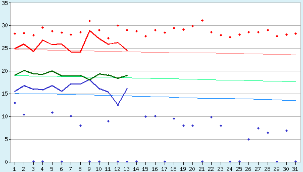 Самая низкая температура воздуха (12.5°) была 12 октября. Самая высокая температура воздуха (28.9°) была 9 октября.