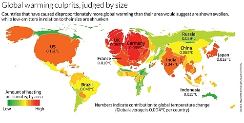 Для вящей наглядности подготовлена приводимая здесь карта (полностью — тут), на которой страны растянуты или уменьшены в зависимости от их вклада в потепление. Западная Европа, США, Япония и Индия распухли до неузнаваемости, Россия, Китай и Бразилия остались более или менее в своих размерах; Канада, Австралия и бóльшая часть Африки стали худыми, как щепка. С этой точки зрения вклад России, Бразилии и Китая в изменение климата нельзя назвать из ряда вон выходящим, он пропорционален занимаемой этими странами территории.